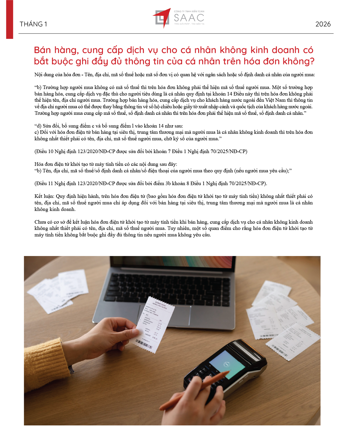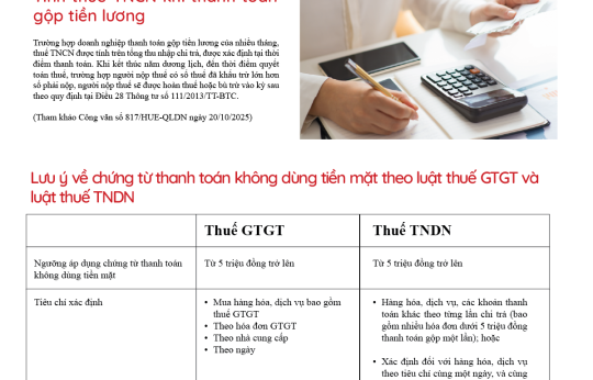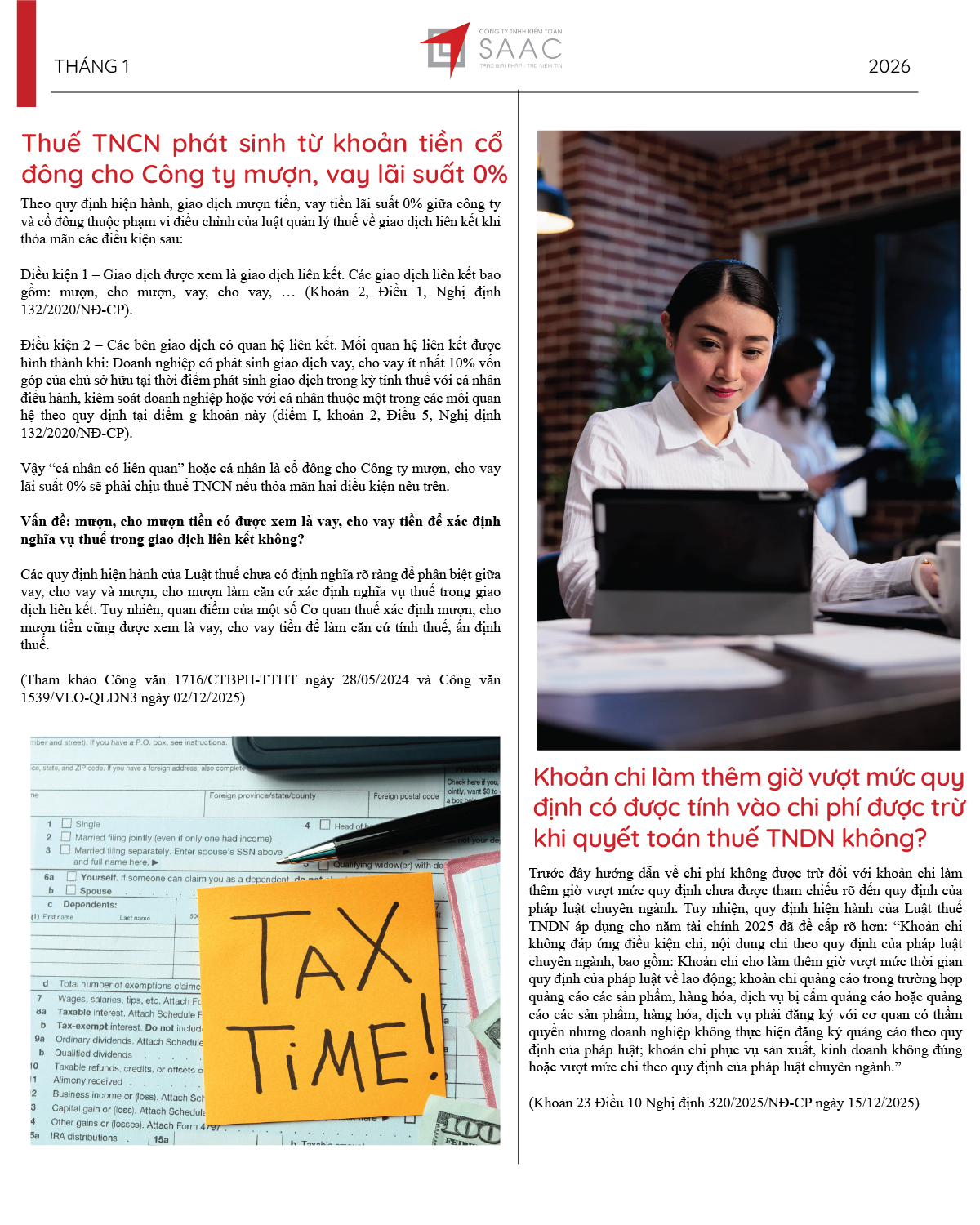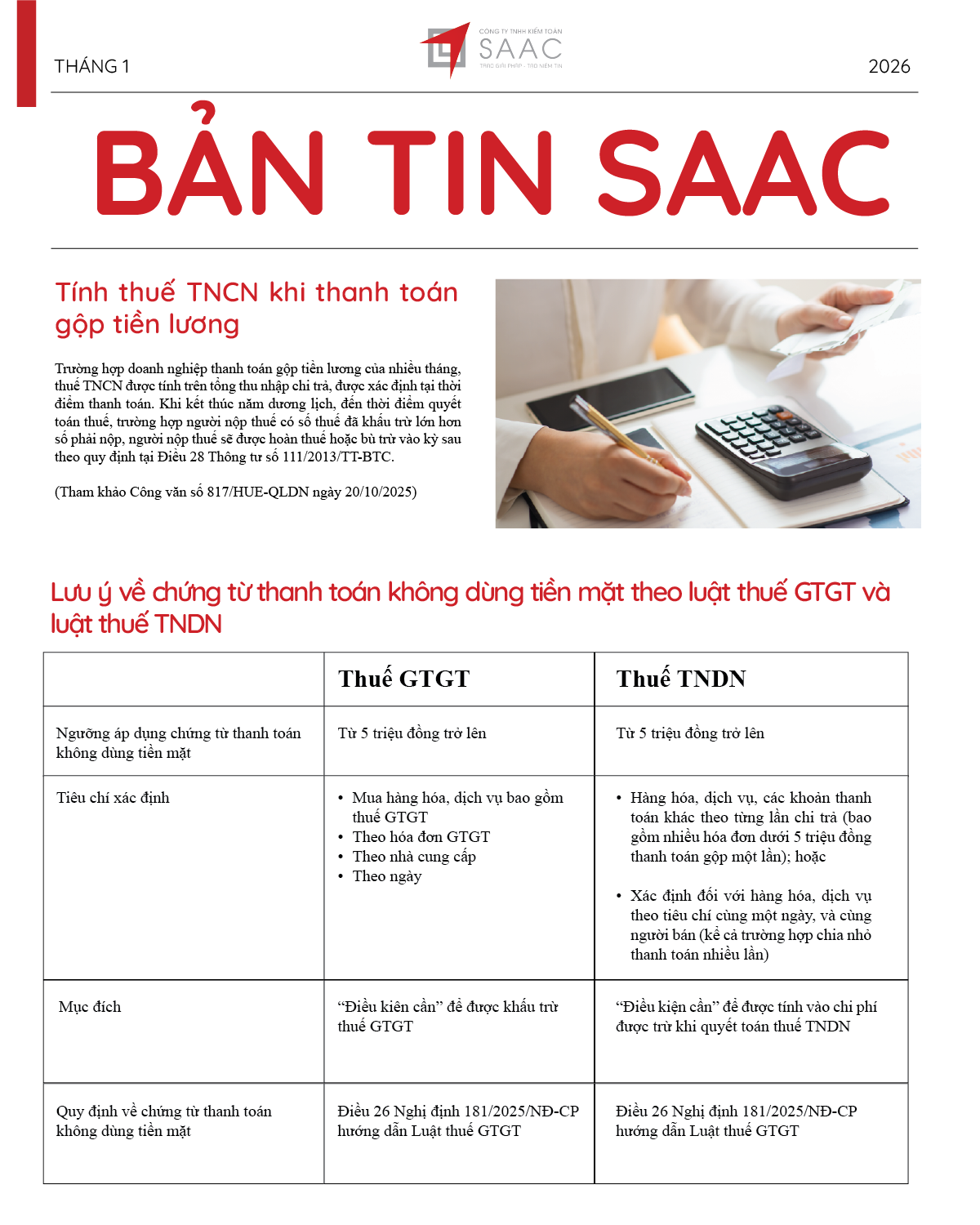 Bản tin SAAC tháng này cập nhật các lưu ý vềTính thuế TNCN khi thanh toán gộp tiền lương, Thuế TNCN phát sinh từ khoản tiền cổ đông cho Công ty mượn, vay lãi suất 0%, Bán hàng, cung cấp dịch vụ cho cá nhân không kinh doanh có bắt buộc ghi đầy đủ thông tin của cá nhân trên hóa đơn không?, Lưu ý về chứng từ thanh toán không dùng tiền mặt theo luật thuế GTGT và luật thuế TNDN, Khoản chi làm thêm giờ vượt mức quy định có được tính vào chi phí được trừ khi quyết toán thuế TNDN không?